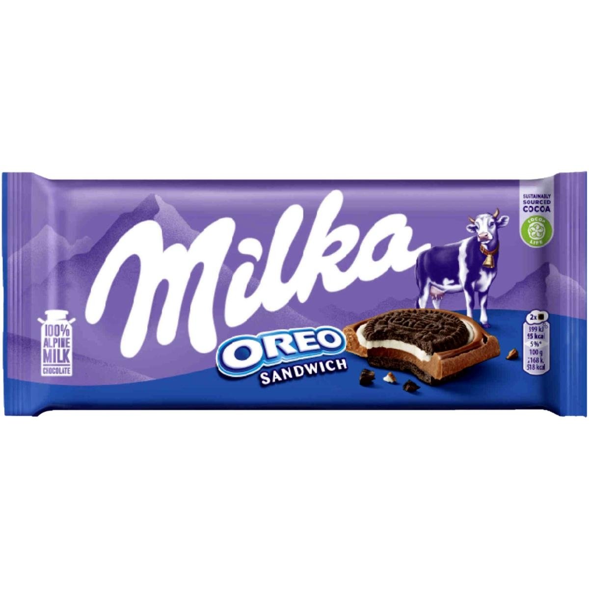 Indulge in the perfect combination of smooth Milka Alpine milk chocolate and the iconic Oreo sandwich biscuit. This delicious bar features a creamy milk chocolate coating with a crunchy Oreo biscuit and soft vanilla cream filling inside, creating a rich, layered texture in every bite. A delightful treat for chocolate and Oreo lovers, perfect for snacking, sharing, or adding a premium touch to your gift hampers.
