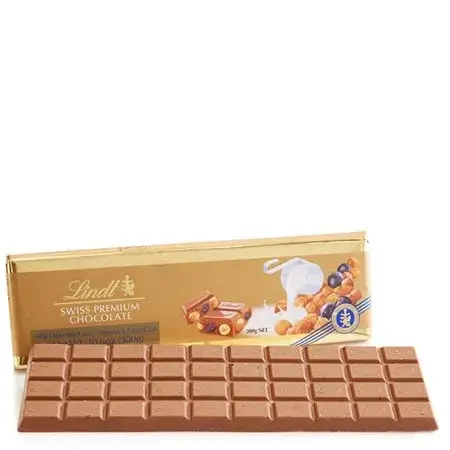 The Lindt Swiss Premium Hazelnut Milk Chocolate (300g) is a luxurious “Gold Bar” that pairs smooth Swiss milk chocolate with generous pieces of crunchy, roasted hazelnuts. At three times the size of a standard bar, it is designed for gifting or sharing during special occasions.