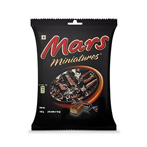 Mars Miniatures is a 150g bag containing approximately 15 bite-sized Mars bars. Nougat, caramel, and milk chocolate in mini form.