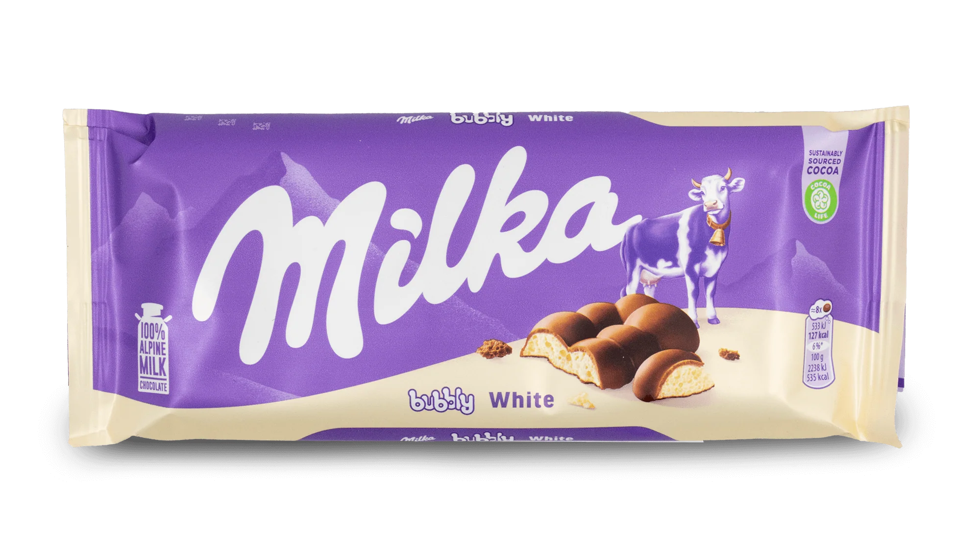 Experience a light and airy twist on classic white chocolate with Milka Bubbly White Chocolate. Made with rich Alpine milk, this unique bar features a soft, bubbly texture that melts effortlessly in your mouth. Each bite delivers a creamy, sweet flavor with a delicate, aerated feel that makes it extra enjoyable. Perfect for those who love smooth white chocolate with a fun texture, whether for personal treats, gifting, or premium hampers.