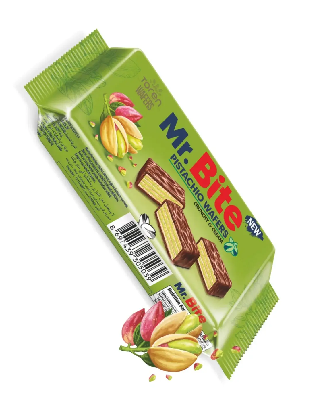 Toren Mr.Bite Pistachio Wafers combine crispy wafer layers with rich pistachio cream filling, all coated in smooth chocolate. A 32g Turkish-made treat.